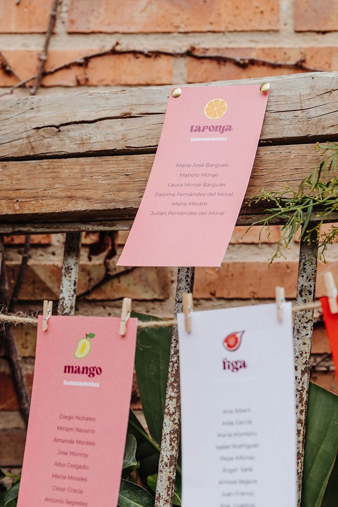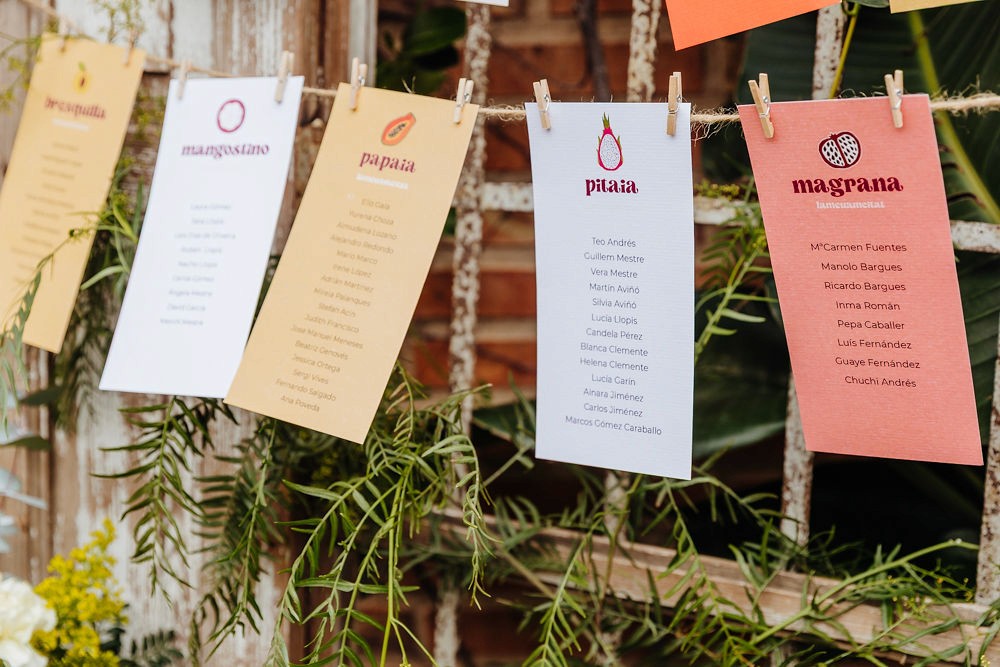 Cada carmelita representaba una fruta, aportando un toque divertido y original que sorprendió a los invitados y convirtió la organización de las mesas en un detalle memorable. Este seating plan no solo guiaba a los invitados, sino que se convirtió en un elemento decorativo que reflejaba perfectamente la personalidad y estilo de la pareja.